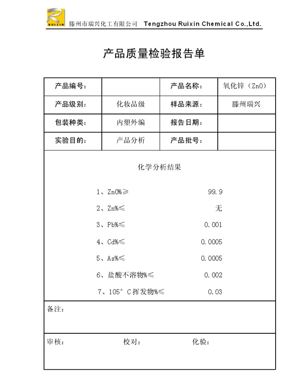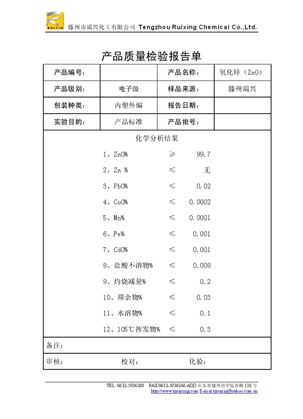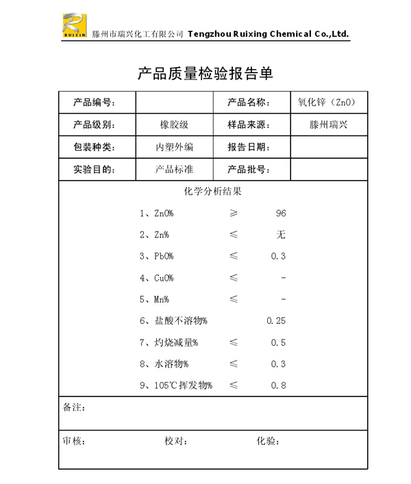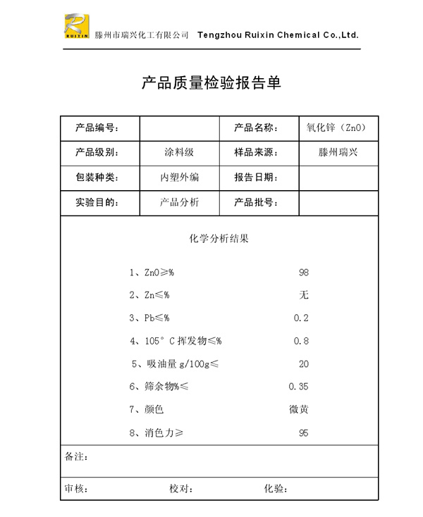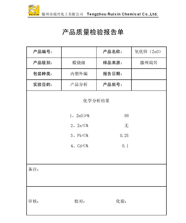 瑞興化工有限公司是生產(chǎn)氧化鋅的重點(diǎn)企業(yè),于2008年通過ISO9001:2008質(zhì)量管理體系認(rèn)證。“瑞興”牌氧化鋅在國(guó)內(nèi)擁有較大穩(wěn)定的市場(chǎng),并遠(yuǎn)銷東南亞、中東、中南美等國(guó)家和地區(qū),在國(guó)內(nèi)外享有較高聲譽(yù)。